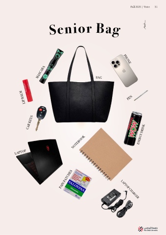 Fall 2025 | Voice 31 Senior Bag MASCARA BAG PHONE LIP BALM PEN CAR KEYS NOTEBOOK ENERGY DRINK LAPTOP PAIN PATCHES LAPTOP CHARGER